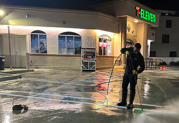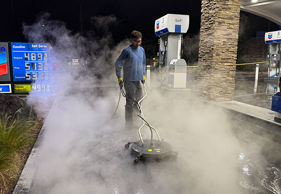 Powerwashco specializes in gas station pressure washing, using commercial-grade pressure washers with 250°F steam to target heavy stains. We handle grease and oil stain removal around pumps, convenience store entrances, and service areas — without disrupting business hours or damaging the concrete.