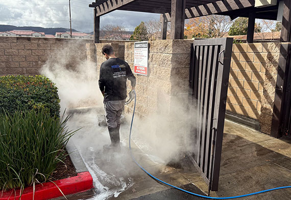 Our trash enclosure pressure washing service uses 250°F high-temperature steam, industrial-grade degreasers, and targeted dumpster pad pressure washing to break down buildup, remove grease stains, oil stains, disinfect surfaces, and flush out nearby drain areas.